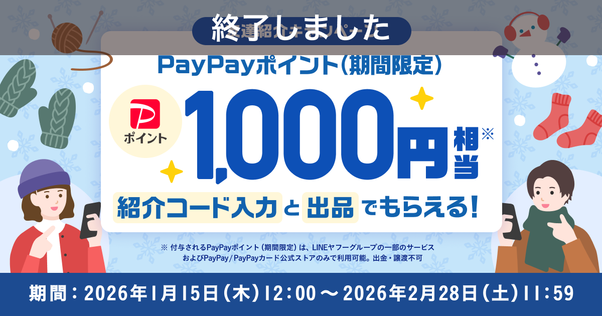 2026年1月15日(木)12:00~2026年2月28日(土)11時59分までYahoo!フリマアプリを初めて使う人が、紹介コードの入力とはじめての出品を行うと、紹介した人もされた人も1,000円相当のPayPayポイント(期間限定)をもらえます!