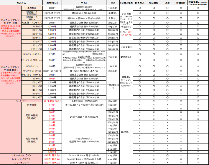 今回はこれらの送料を中心に表にまとめました